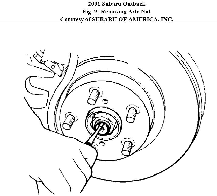 4. Remove axle nut while depressing brake pedal to prevent front drive shaft from turning.