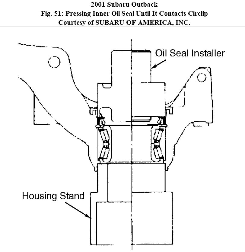 4. Using oil seal installer and housing stand, press inner oil seal until it contacts circlip. See Fig. 51.