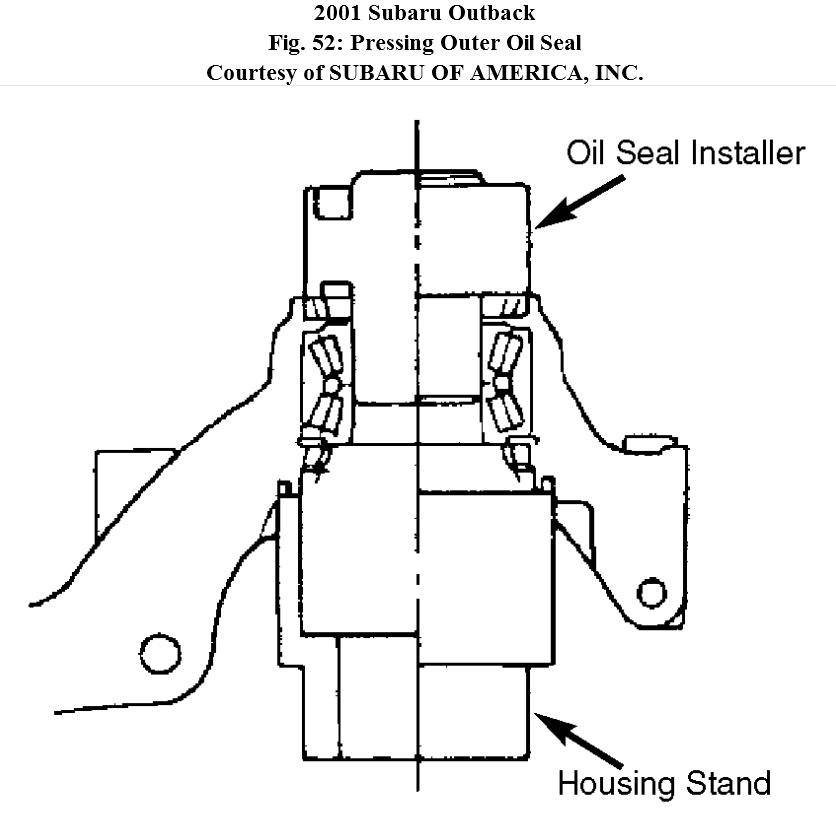 6. Using oil seal installer and housing stand, press outer oil seal until it contacts the bottom of housing. See Fig. 52.