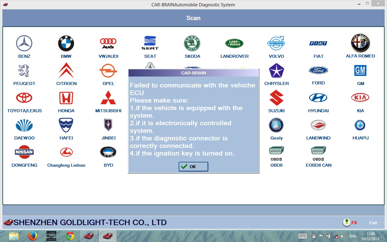 I have bought carbrain C168 scanner befor week, but it has not in work any car, it has showed error massege '' failed to communicate with the vehicle ECU '' Please tell me what is the problem. Please see below it.