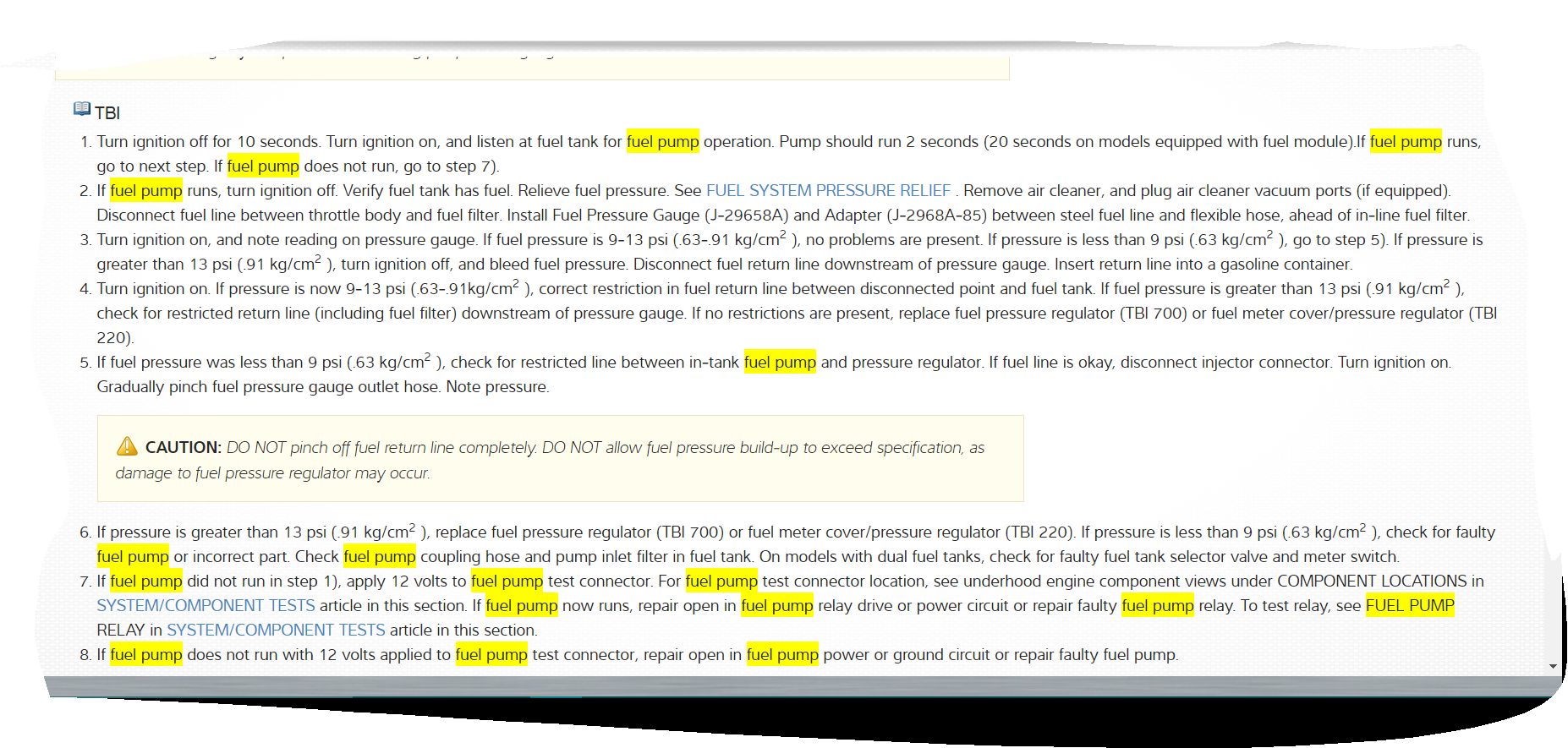And when you have a pressure gauge hooked up with the engine running, and the fuel pump is producing pressure within specification, let it run until the engine starts stuttering and stalling, to make sure the fuel pump pressure remains stable and within the 9-13lb. spec.,as it stutters and stalls.