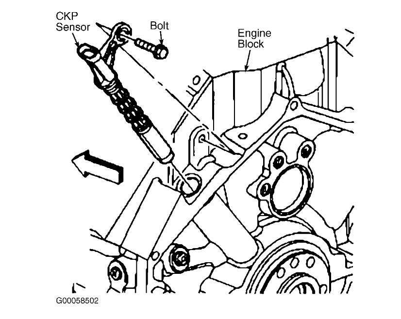 NOTE: Care must be taken when removing the crankshaft position (CKP) sensor. Use penetrating oil and allow to soak around the CKP sensor before removing the sensor. Twist the CKP sensor to break the "O" ring seals loose. When removing the CKP sensor, pull the sensor straight out of the engine block at the same angle the sensor was installed. Failure to be careful may result in sensor damage.