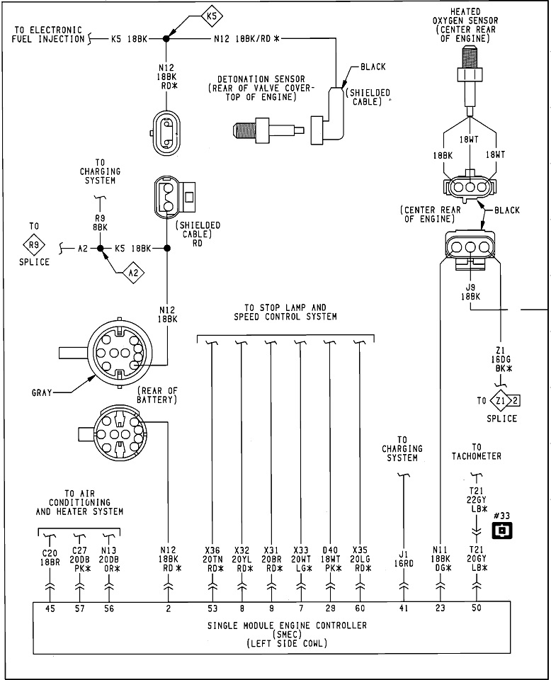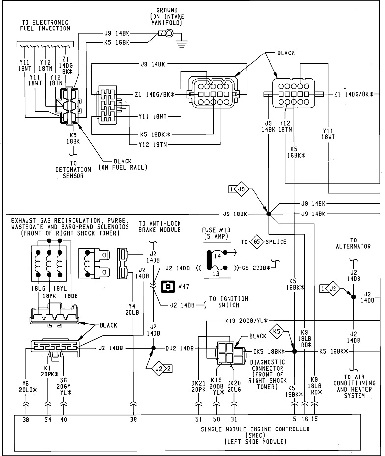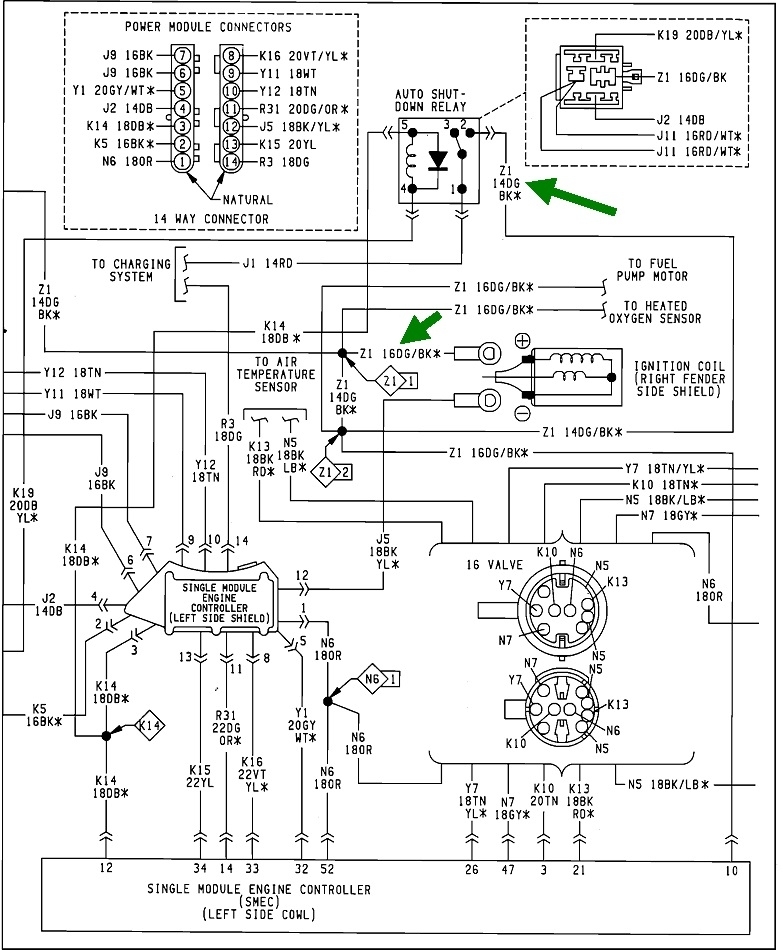 Next, it sounds like you were on the right track when looking at voltages on the ignition coil. The one in question is the positive terminal. 12 volts to the ignition coil(s), injector(s), oxygen sensor heaters, alternator field, and fuel pump or pump relay is switched on through the automatic shutdown, (ASD) relay, (third diagram). The Engine Computer turns that relay on two times. The first is for two seconds when you turn on the ignition switch. That is to get fuel pressure up high enough for starting in case it bled down over days or weeks. That relay gets turned on again during engine rotation, (cranking or running). On newer models it knows that by the signal pulses it gets from the crankshaft position sensor and the camshaft position sensor. On your engine it gets two signals from pick-ups inside the distributor.