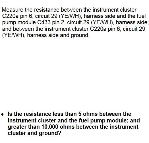 Is the yellow/white wire you mention located in the plug that plugs into the fuel pump and how do I measure the resistance (from where to where) and what would be a normal reading?