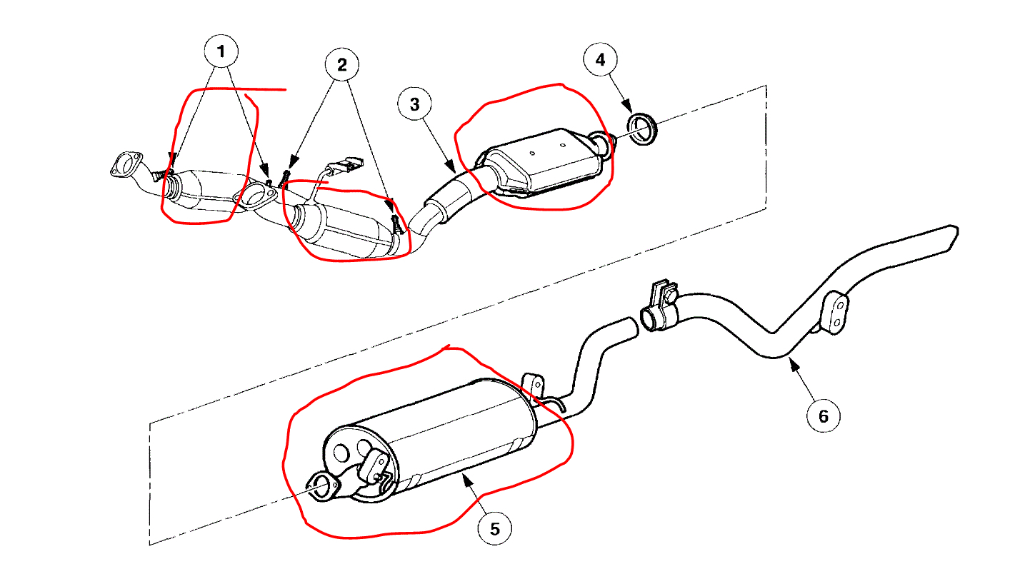 Here is what I suggest trying: First, take a rubber mallet and tap on the exhaust system. See if you can reproduce the sound. If you hear something, have a helper try to locate the source. I attached a pic of the exhaust system and circled four things. The three at the top are catalytic converters. Although the heat shields are not pictures, they should be on them. The bottom pic I circled is the muffler. Pay attention that that as well.