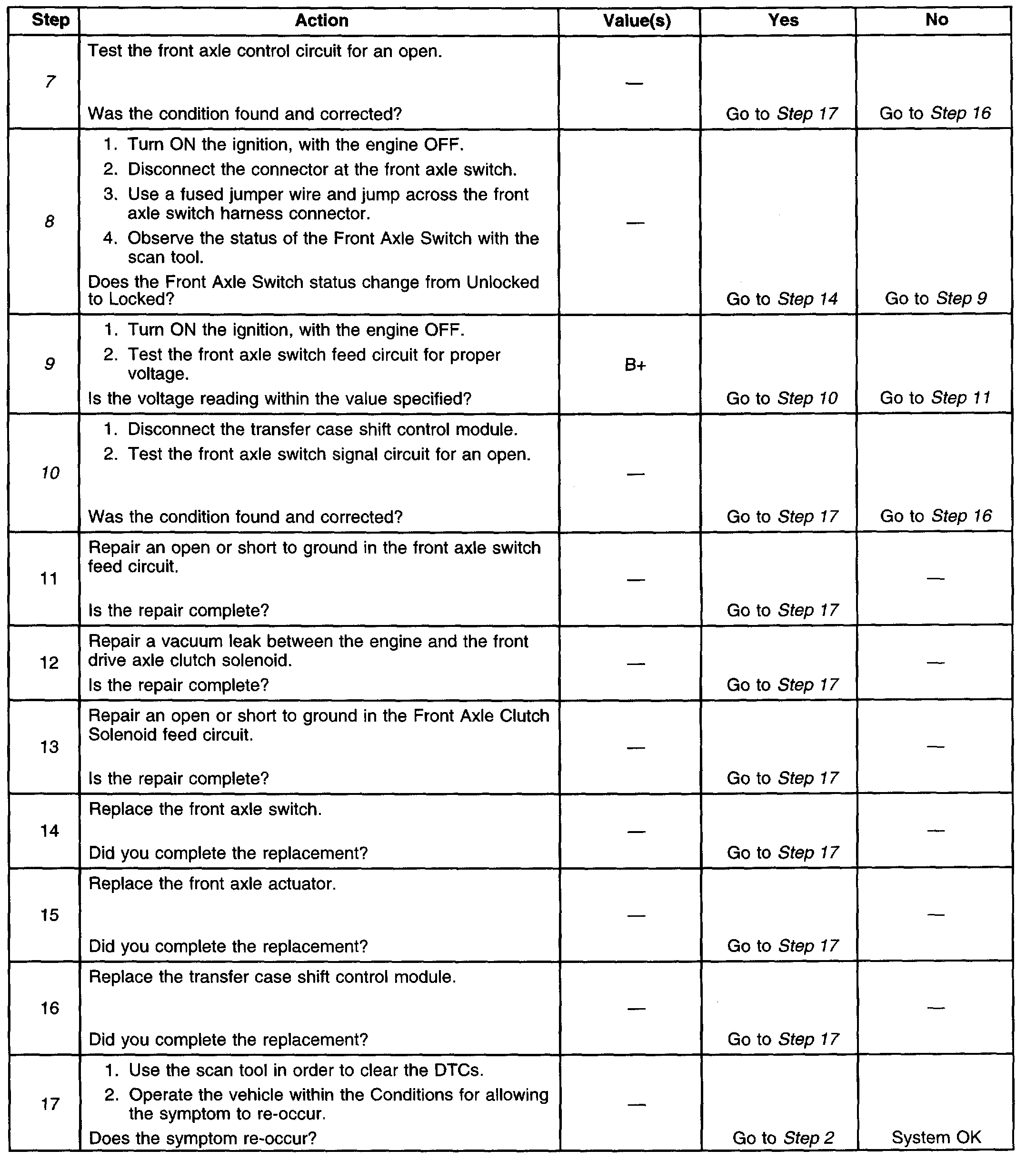 What I suggest is this. I have provided the diagnostics for a front axle not engaging condition. Take a look through everything and let me know if it is something you are comfortable doing or if you have any questions.