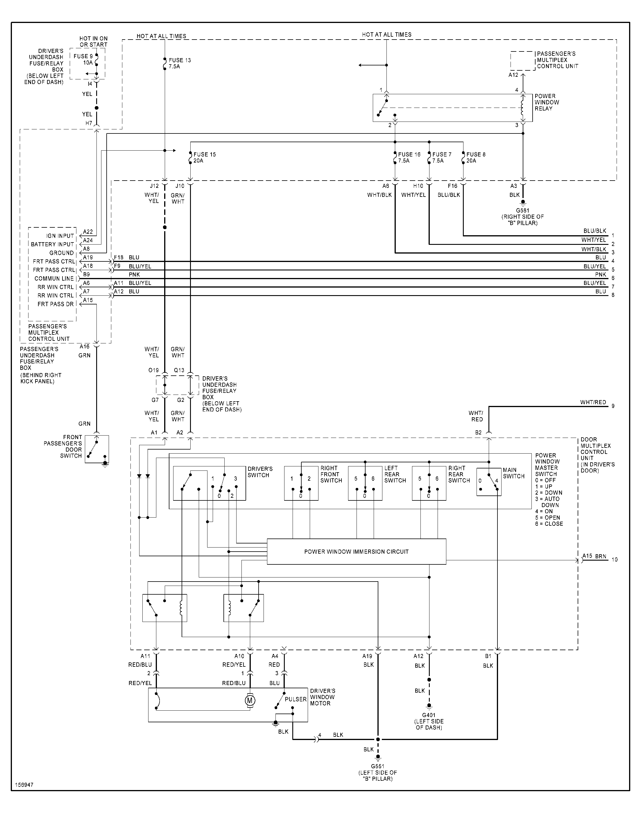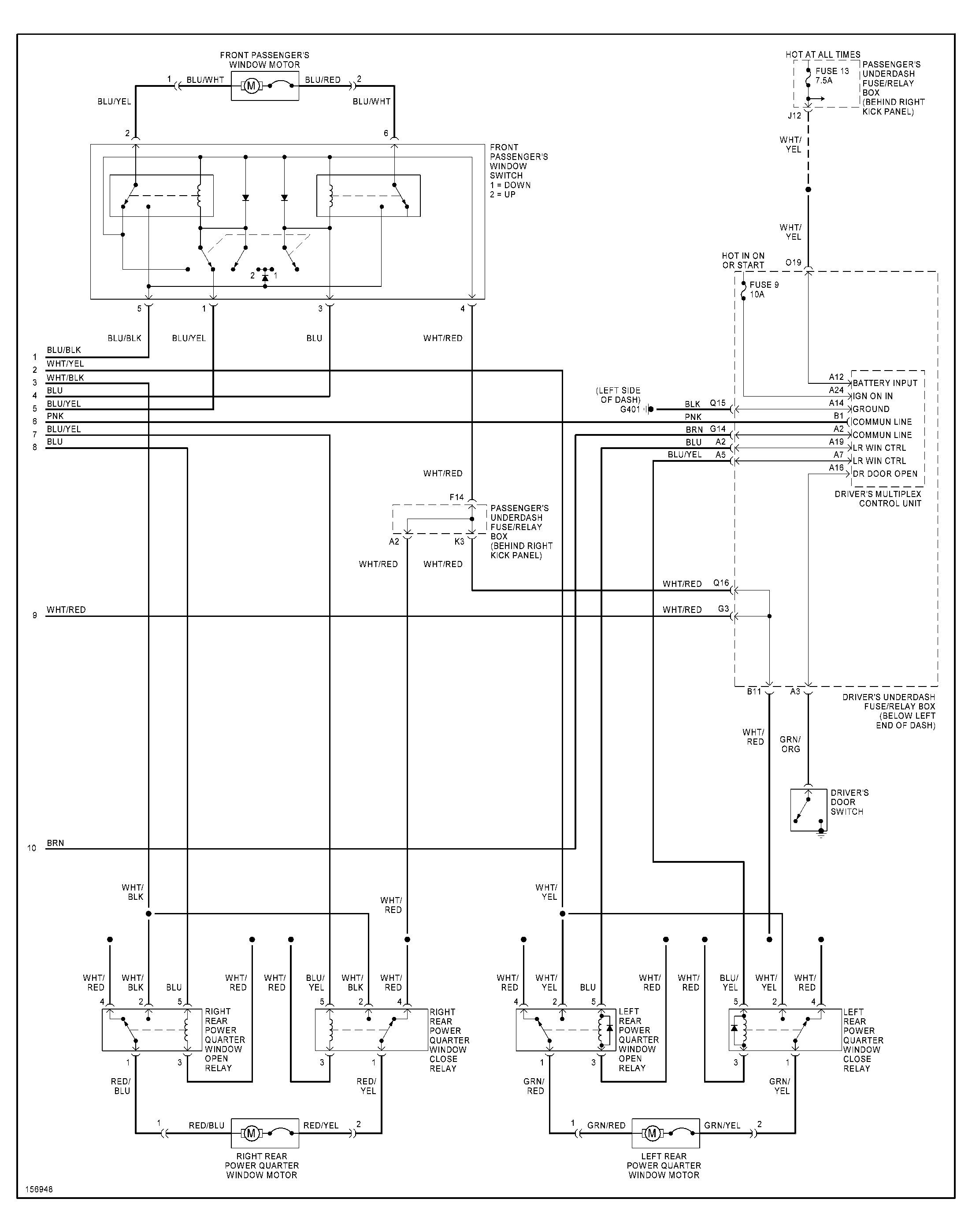 Windows inop. Replace master switch and no the passenger window will operate only from passenger side switch. Vent windows operate interim. Put old switch back in nothing works at all. Driver window inop. Either way.
