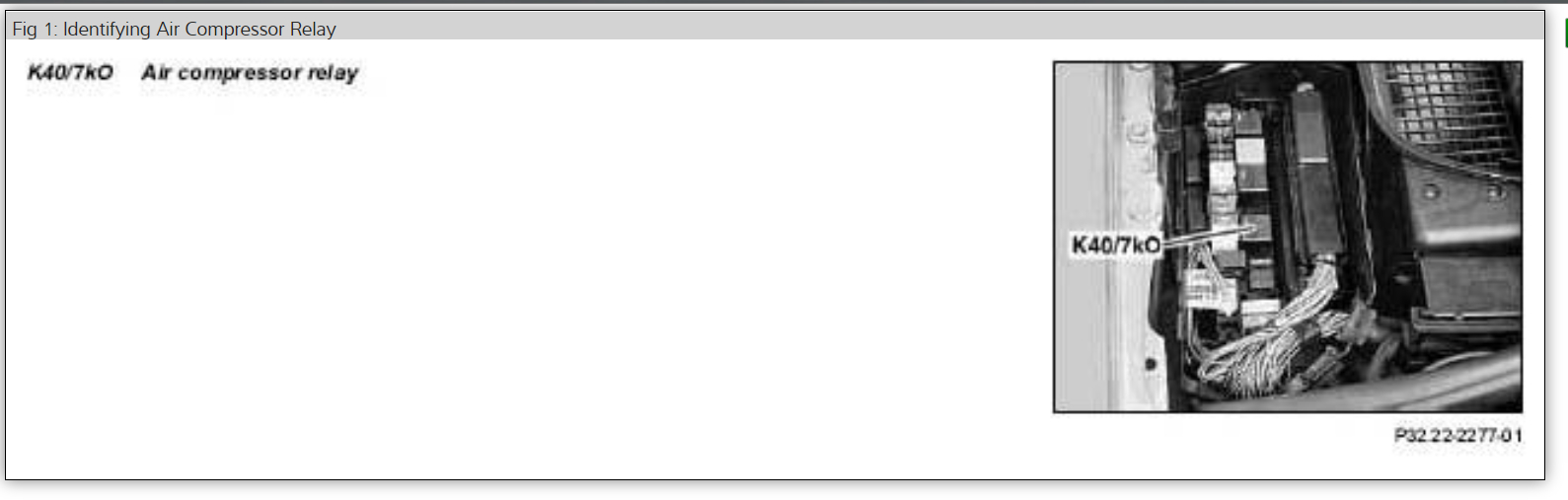 The air suspension relay is located under the hood on the right side here's a guide to help test when you find it from our diagram (below)