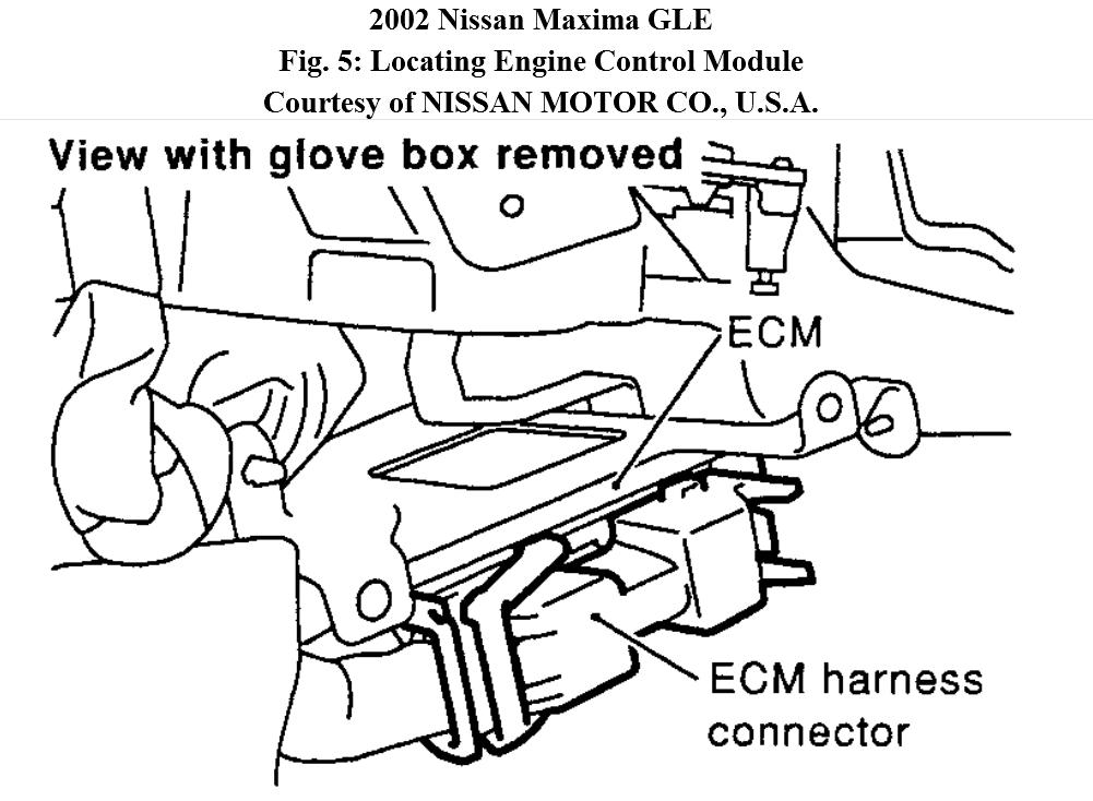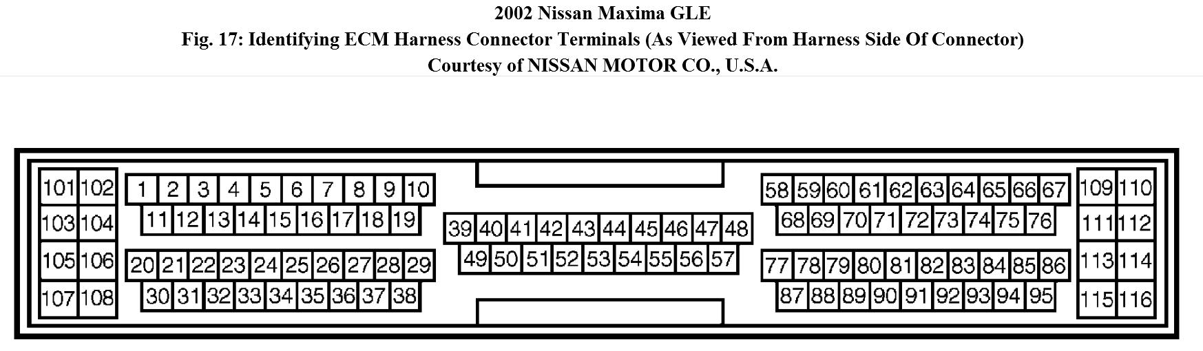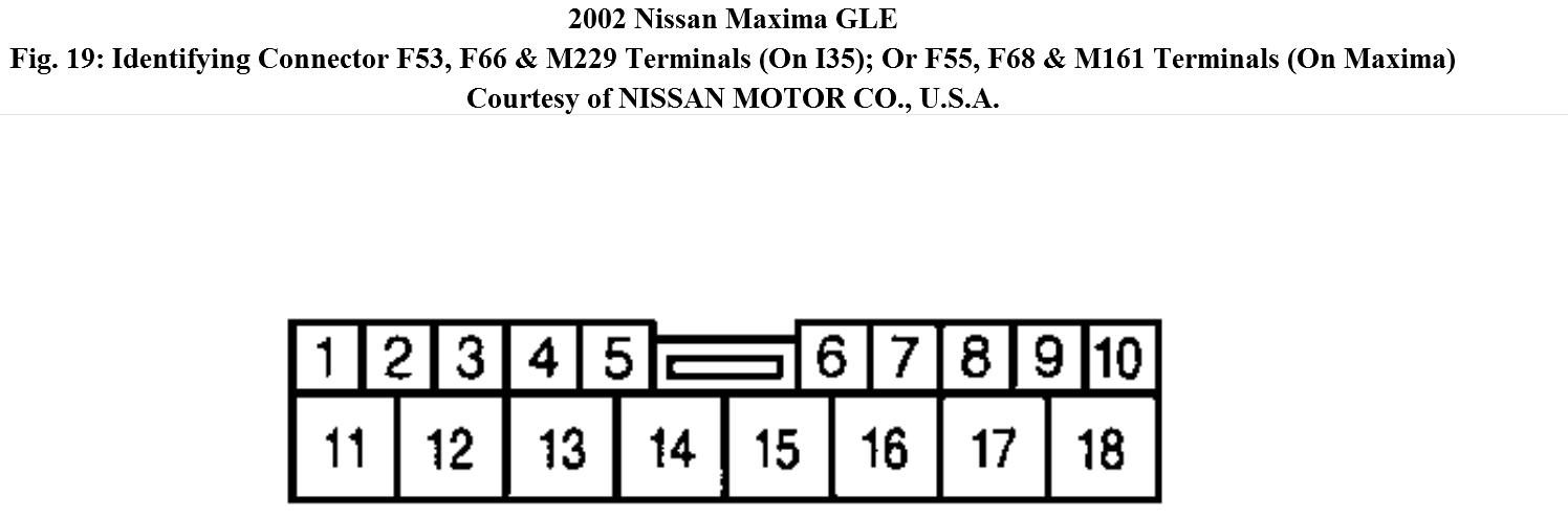 L Check for poor connection at White, 18-pin harness connector F68 (on Maxima) terminal No. 14 (Red/Yellow wire). See Fig. 19. Connector is located under instrument panel.