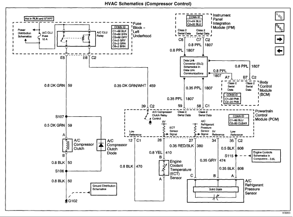 '03 park ave. Compressor doesn't come on after dealer engine change. Relay is good, fuse good, 12v present at both. A/c clutch supplied 12v and ground - clutch works. System is still charged. 12v present at both terminals of compressor plug (no ground)