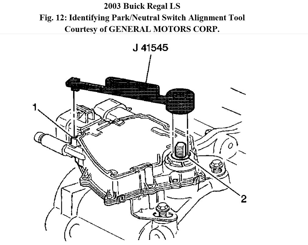 3. Use the Park/Neutral Switch Alignment Tool (J-41545) to align the flats of the shift shaft to the flats (1 and 2) on the PNP switch. See Fig. 12.