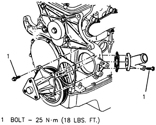 3. Install the 2 bolts that secure the water pump to the engine block and tighten to 15 ft. Lbs. (20 Nm).