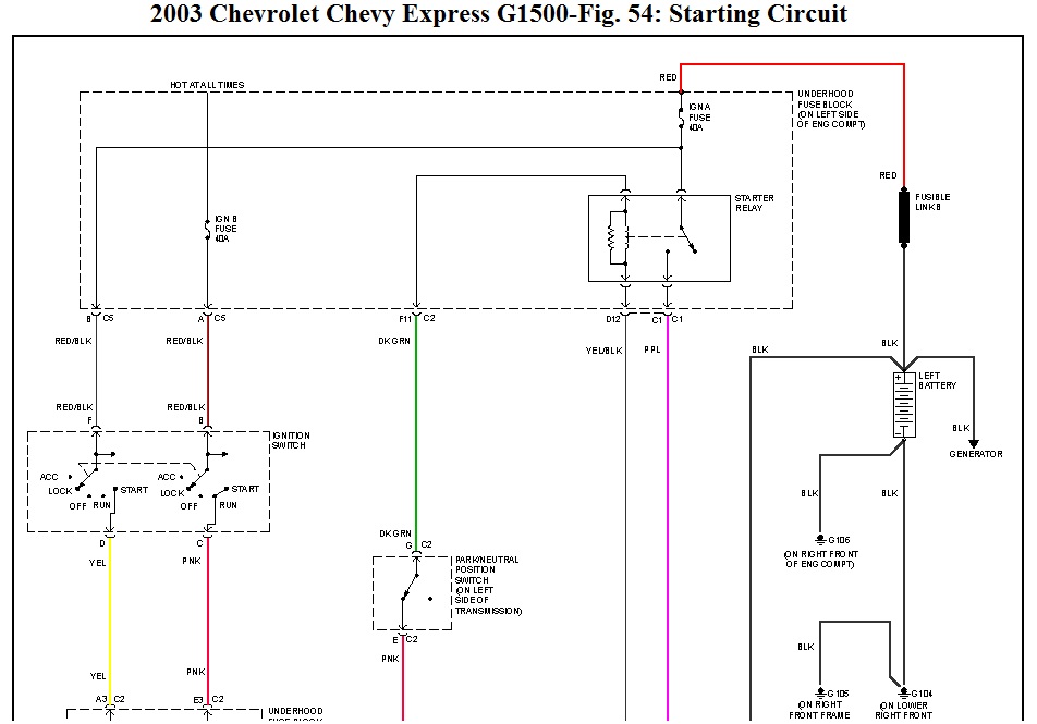 The info I looked at was for g1500 chevy express. In the diagram, not only check the fuses, check for proper voltage at the fuse circuits. Also, check fusible link. Any testing at the starter make sure tranny is in park or neutral and the parking brake is set. The starter s terminal goes hot with key in the crank position. The other terminal at starter comes from + battery, hot all the time.