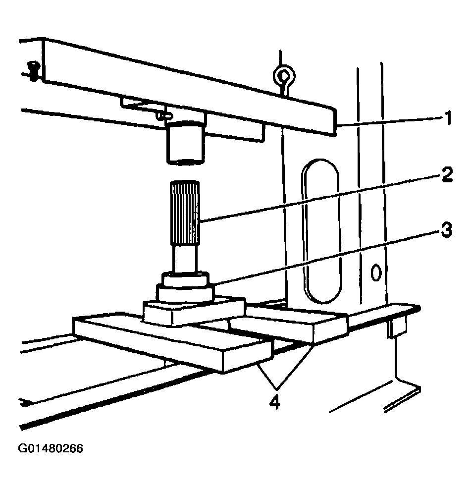 Propeller Shaft Center Support Bearing Replacement Removal Procedure Raise the vehicle. Refer to JACKING AND LIFTING. Remove the propeller shaft. Refer to Propeller Shaft Replacement - Two Piece. Remove the center bearing by doing the following: 3.1. Stand the propeller shaft (2) on end in the press (1) with the center bearing (3) supported by the press bars (4). 3.2. Press the propeller shaft (2) down and off the center bearing (3). Fig. 34: Propeller Shaft, Center Bearing, Press & Press Bars
