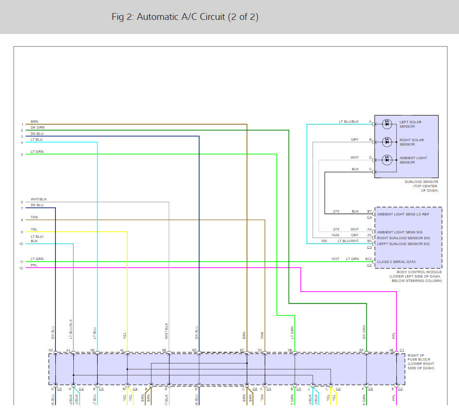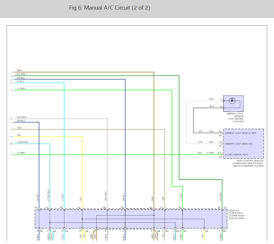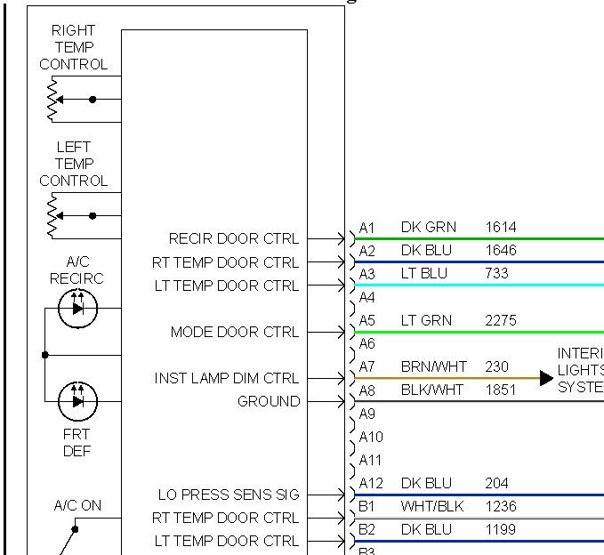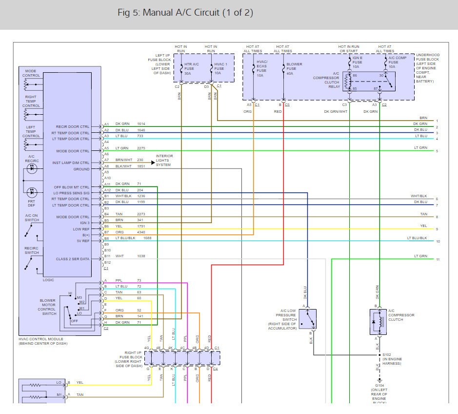If this does not also sense a low-pressure cutoff, then I think the issue is between the dash controls and the PCM. The issue is finding this wire since it changes somewhere from white to blue.