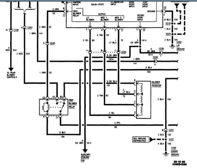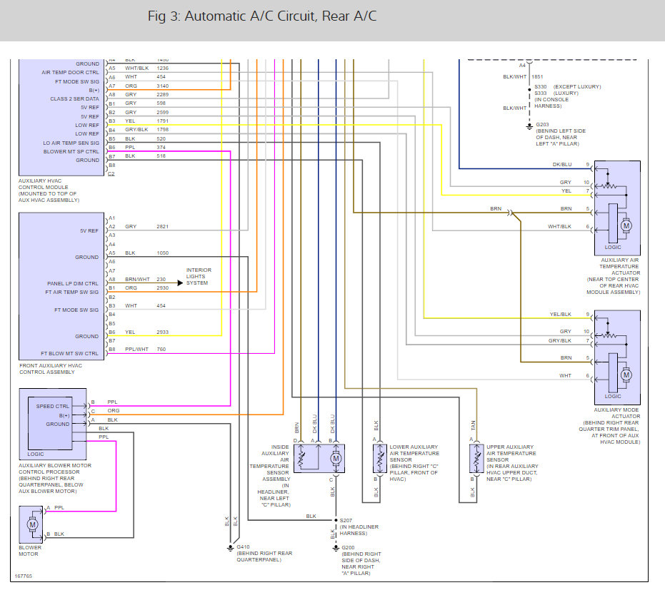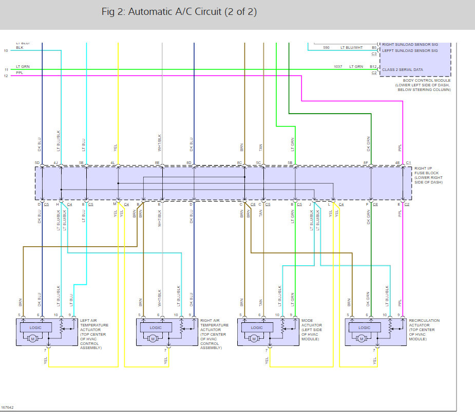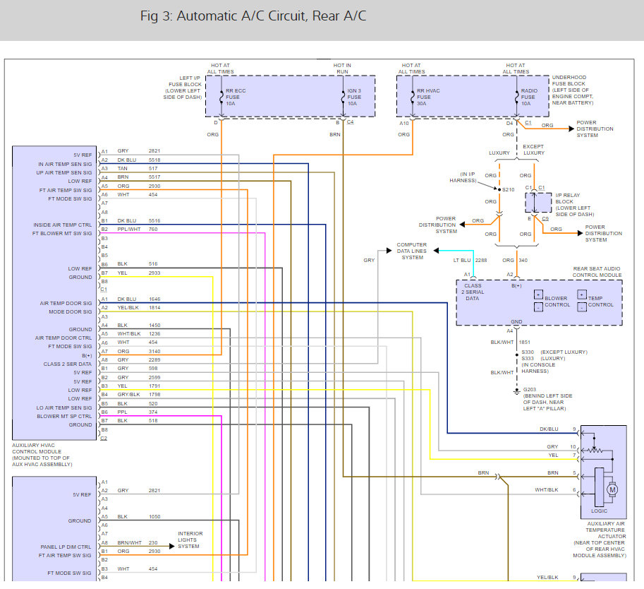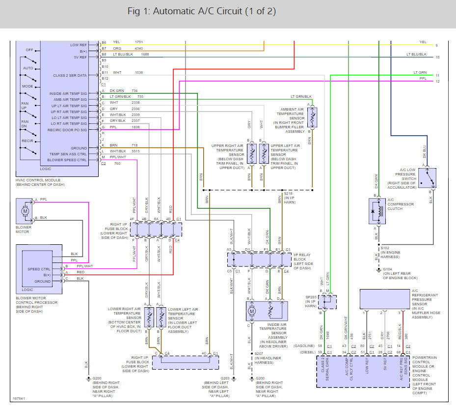 If this does not also sense a low-pressure cutoff, then I think the issue is between the dash controls and the PCM. The issue is finding this wire since it changes somewhere from white to blue.