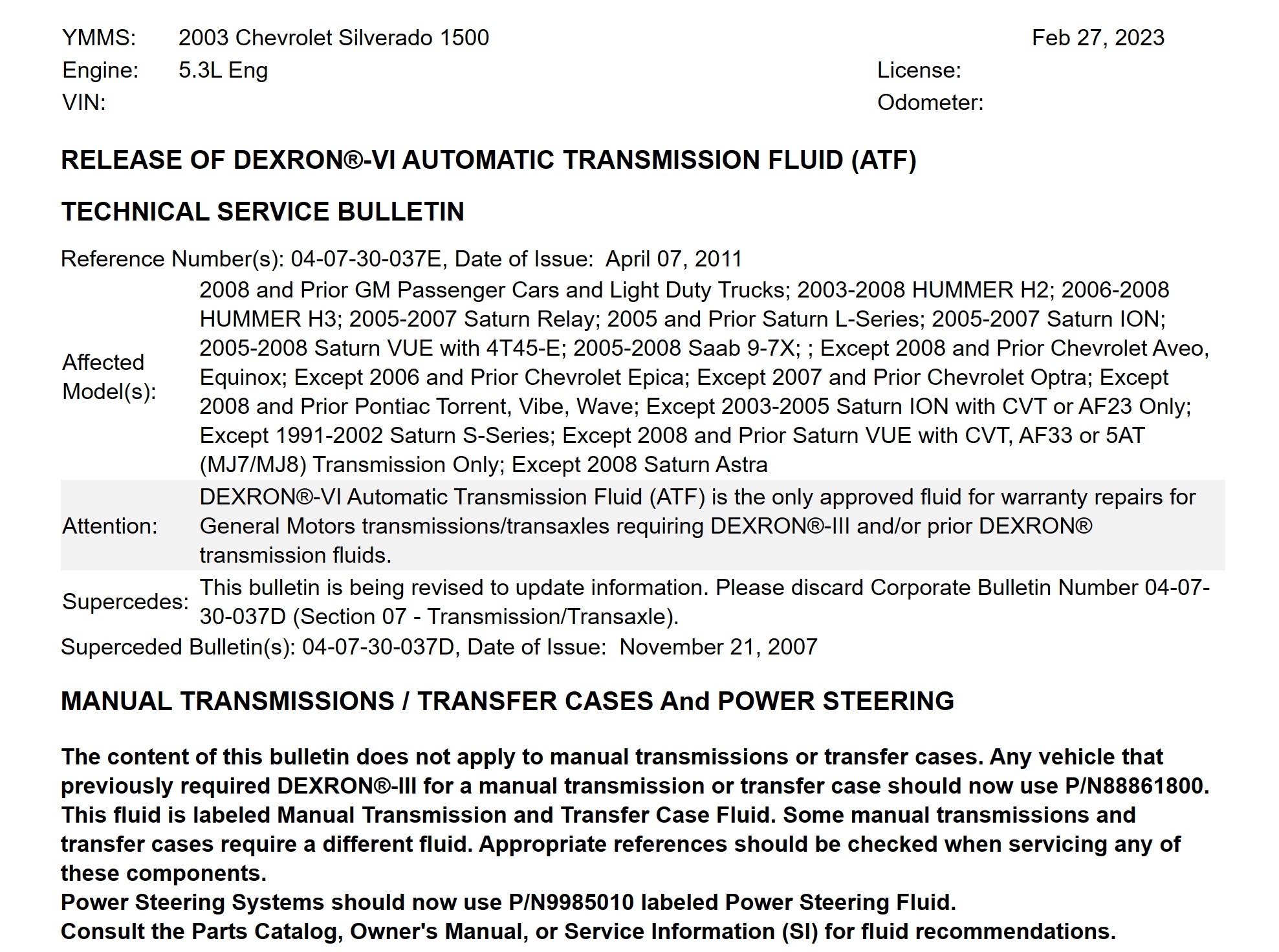 There was a Technical Service Bulletin (TSB) released April of 2007 TSB-04-07-30-037C, then updated in 2011 04-07-30-037E. This TSB basically states 2008 and prior GM Passenger Cars and Light Duty Trucks, among others, should be changed from DEXRON-III to DEXRON-VI. (I will attach screenshots of the TSB for you.)
