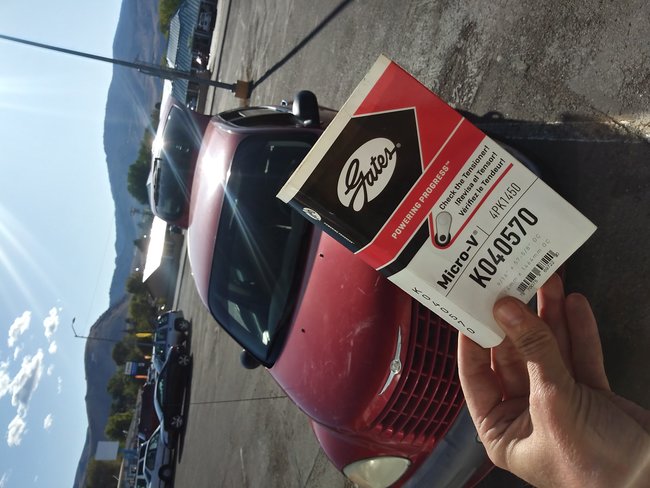 The power steering a/c belt sold @ stores is the wrong size(k040560). I went through multiple belts only to realize after ( and yes the belt wont go on with tensioner pulled back with out a flat head and manpower. I needed someone else to keep the tensioner back. ) It popped off at every acceleration. I just replaced it with k040570. Its about a half inch bigger. Slips right on. So far all good!
