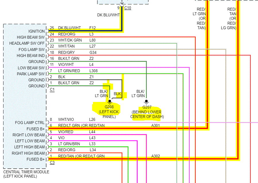 Okay, since the lights turn on dim, it sounds like power is likely back-feeding due to a faulty ground. There are two ground locations under the dash I need you to check. See pic below
