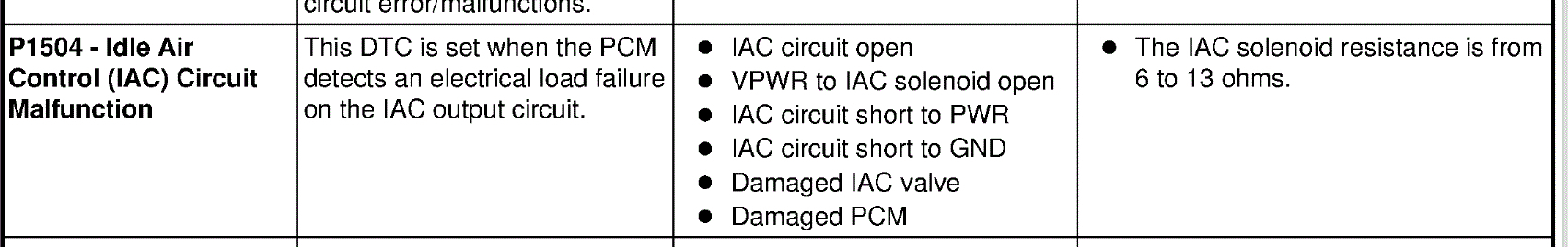 The code, P1504, is related to the idle air control (IAC) circuit. The problem could be electrical, an issue with the IAC itself, or a computer-related issue. If you look at the attached pic, it indicates possible causes for the problem.
