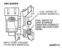 - Connect a hand vacuum pump at the fuel vapor port to EVAP canister at the EVAP canister purge valve (or VMV).