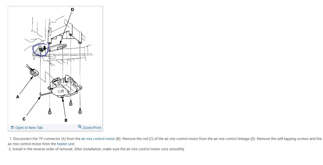 My Air Mix Control Valve is stuck on heat on the drivers side. I.E. If I turn the temp way down, the passenger side is cold but the drivers side is hot, very very hot. Where do I physically locate the Air Mix Control Valve? On the passenger floorboard or under the hood? Can I find any pictures of it? What is the Honda part number?