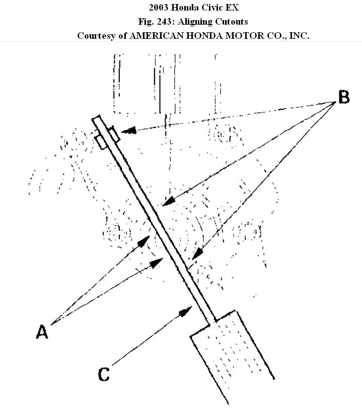 7. Align the cutouts (A) on the rotary-frame with the neutral positioning cutouts (B) on the transmission range switch, then put a 2.0 mm (0.08 in.) Feeler gauge blade (C) in the cutouts to hold it in the N position.