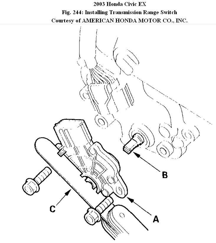8. Install the transmission range switch (A) gently on the control shaft (B) with holding the N position with the 2.0 mm (0.08 in.) Blade (C).