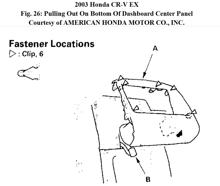 2. Pull out on the bottom of the dashboard center panel (A) to create a gap between the dashboard and panel. Gently pull out along the panel to release the clips, then remove the panel. Disconnect the hazard warning switch connector (B). Fig. 26: