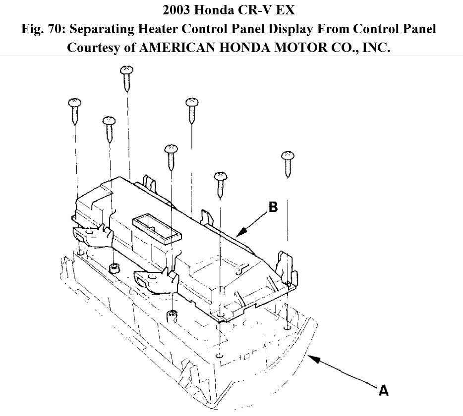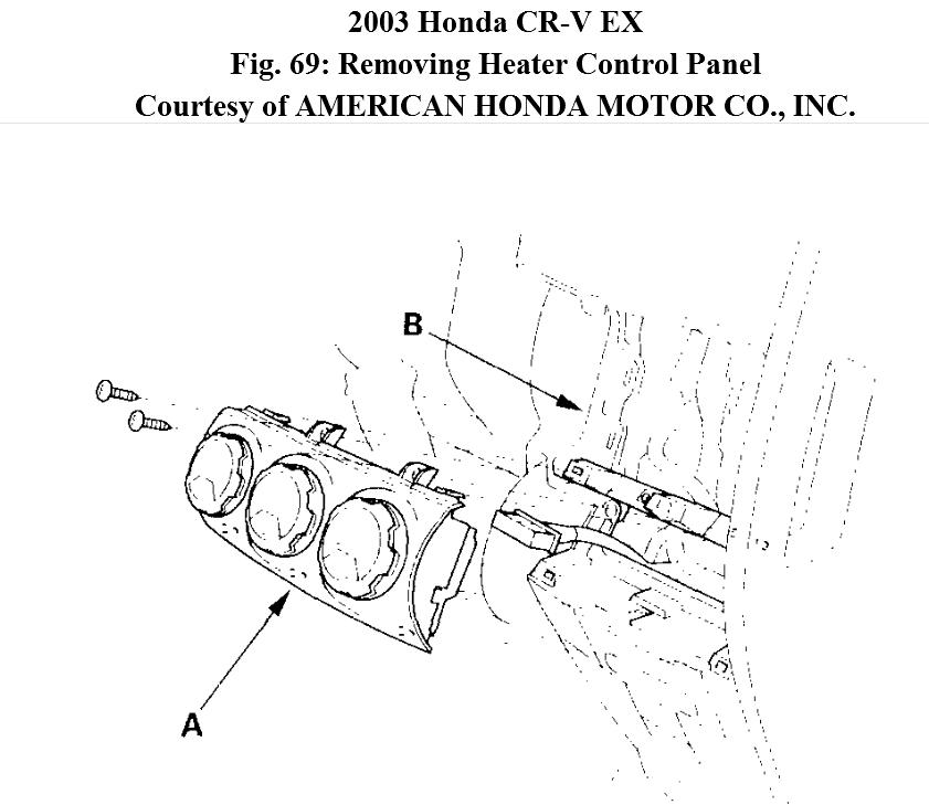2. Remove the self-tapping screws and the heater control panel (A) from the dash board (B).