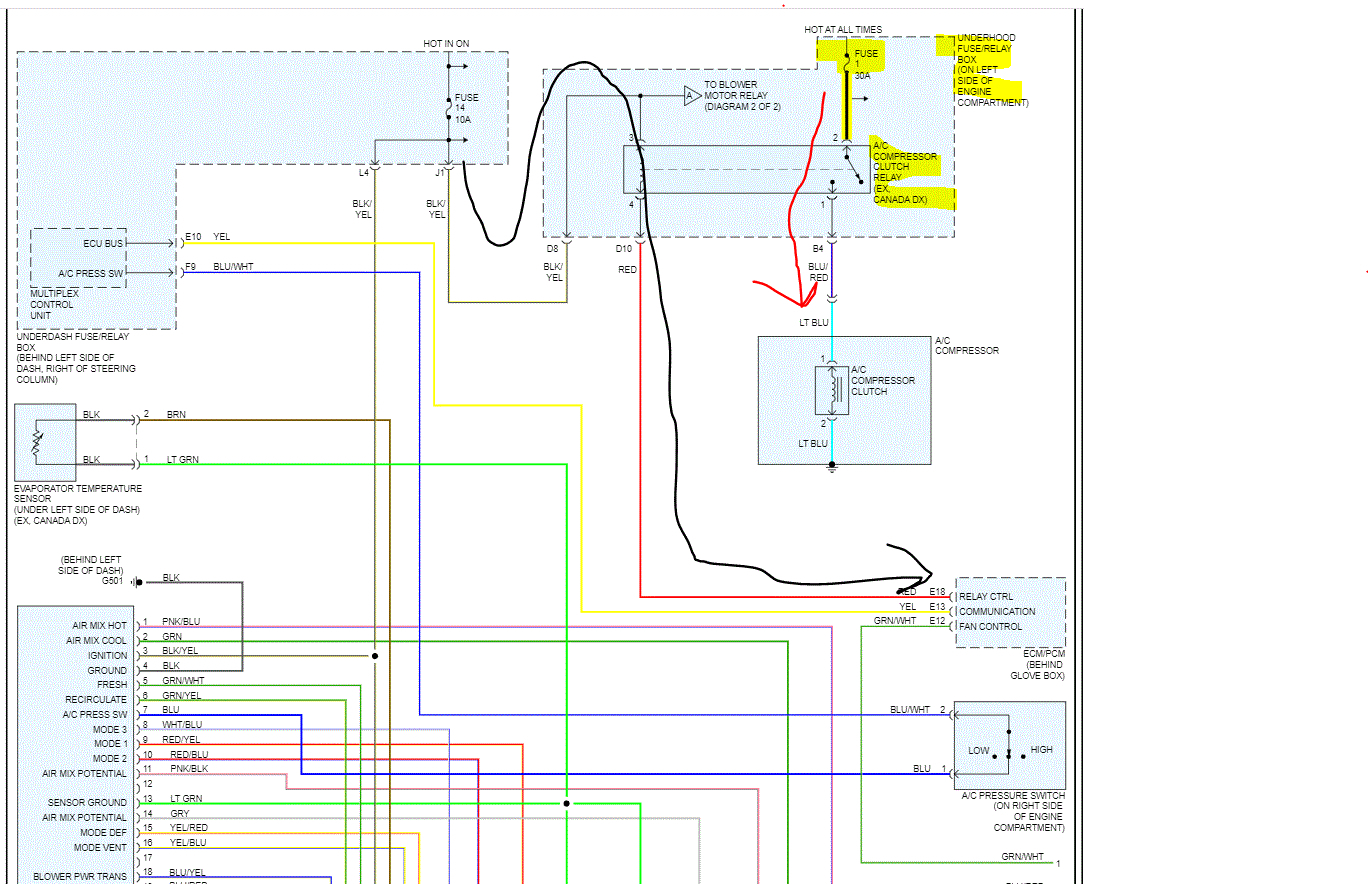 If you look at the pic below, the black wire provides power to one side of the relay when the key is on. When the PCM provides a ground, then the relay closes, and the power goes from fuse 1 (indicated in red) to the clutch.