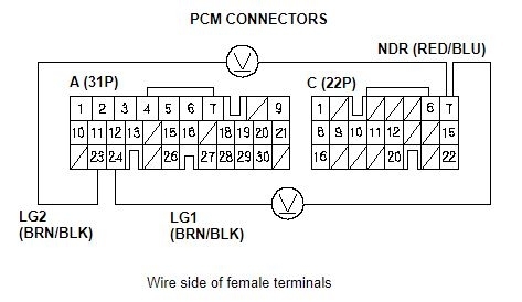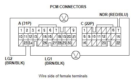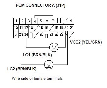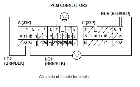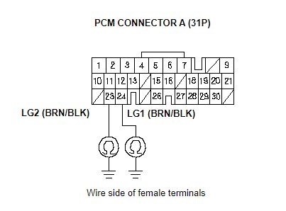 2. Check for continuity between PCM connector terminal A23 and body ground, and between terminal A24 and body ground.