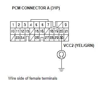 25. Measure the voltage between PCM connector terminals C7 and A23 or A24.