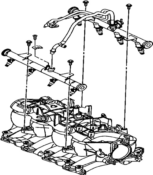 * Injector retainer clip. Insert the fork of a fuel injector assembly removal tool behind the * injector connector between the fuel rail pod and the 3 protruding retaining clip ledges. Use a prying motion while inserting the tool in order to force the injector out of the fuel rail pod.