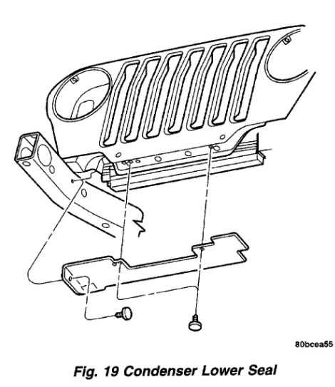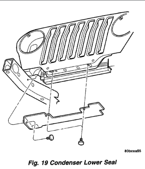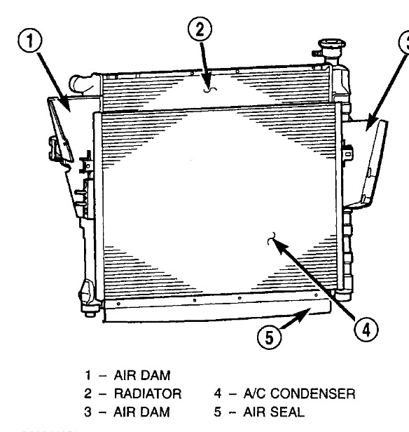 CAUTION: When removing the radiator or A/C condenser for any reason, note the location of all radiator-to-body and radiator-to-A/C condenser rubber air seals. These are used at the top, bottom and sides of the radiator and A/C condenser. To prevent overheating, these seals must be installed to their original positions.