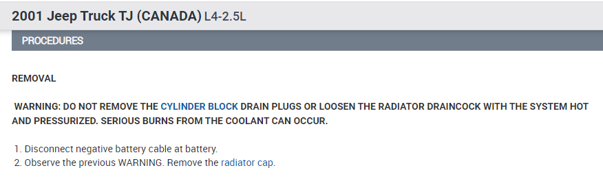 WARNING: DO NOT REMOVE THE CYLINDER BLOCK DRAIN PLUGS OR LOOSEN THE RADIATOR DRAINCOCK WITH THE SYSTEM HOT AND UNDER PRESSURE. SERIOUS BURNS FROM COOLANT CAN OCCUR. REFER TO COOLING SYSTEM DRAINING.