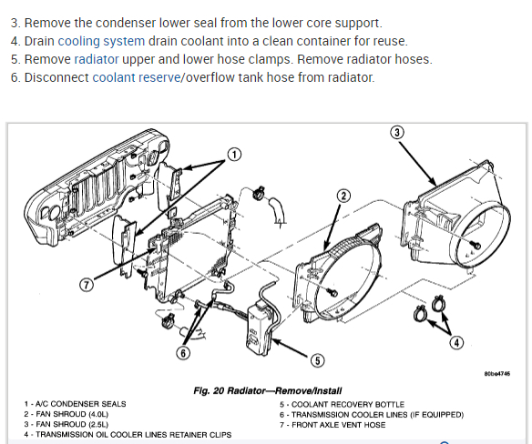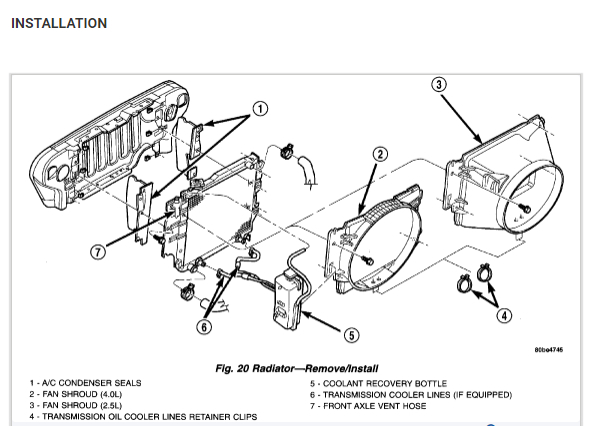 If equipped with an auxiliary automatic transmission oil cooler, use caution when removing radiator. The oil cooler lines are routed through a rubber air seal on the right side of radiator. Do not cut or tear this seal.