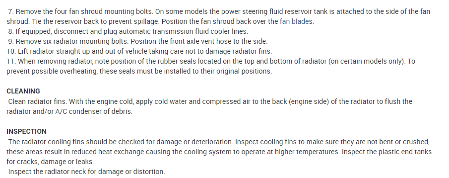 The radiator cooling fins should be checked for damage or deterioration. Inspect cooling fins to make sure they are not bent or crushed, these areas result in reduced heat exchange causing the cooling system to operate at higher temperatures. Inspect the plastic end tanks for cracks, damage or leaks.