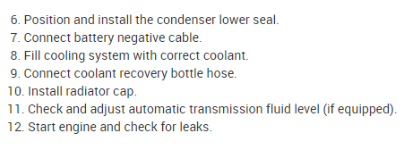 CAUTION: Before installing the radiator or A/C condenser, be sure the radiator-to-body and radiator-to A/C condenser rubber air seals are properly fastened to their original positions. These are used at the top, bottom and sides of the radiator and A/C condenser. To prevent overheating, these seals must be installed to their original positions.