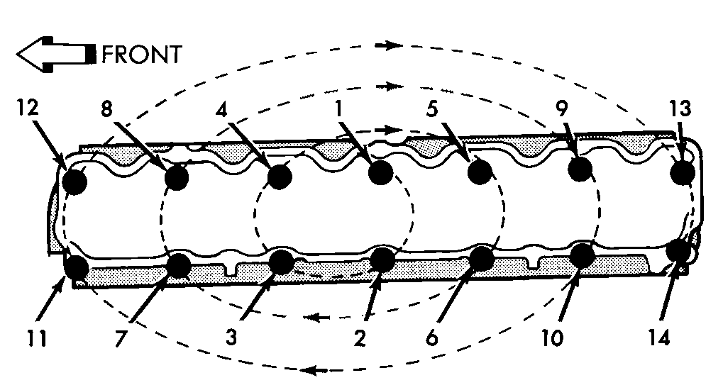A. Tighten all bolts in sequence (1 through 14) to 30 N.M (22 ft. Lbs.) Torque.