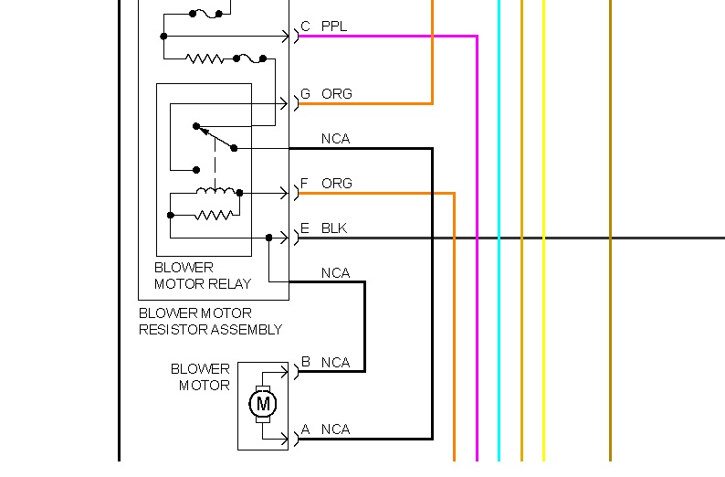 In the diagram, terminal A is voltage for blower motor, terminal B is ground. If you have good voltage and ground with key on, hvac on, and no blower action, suspect the blower motor.