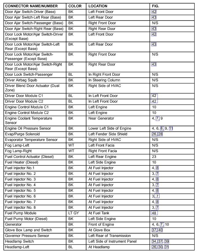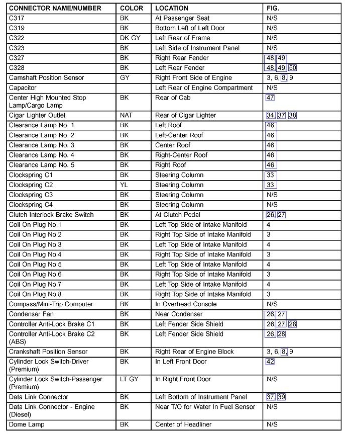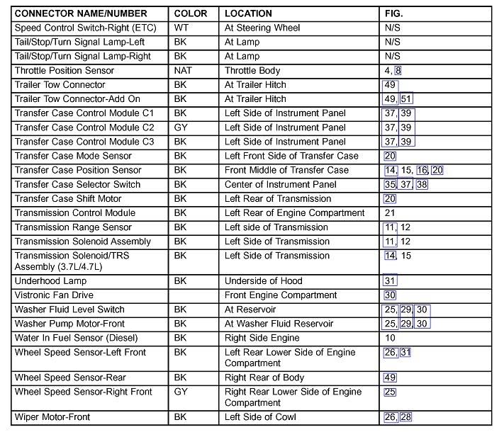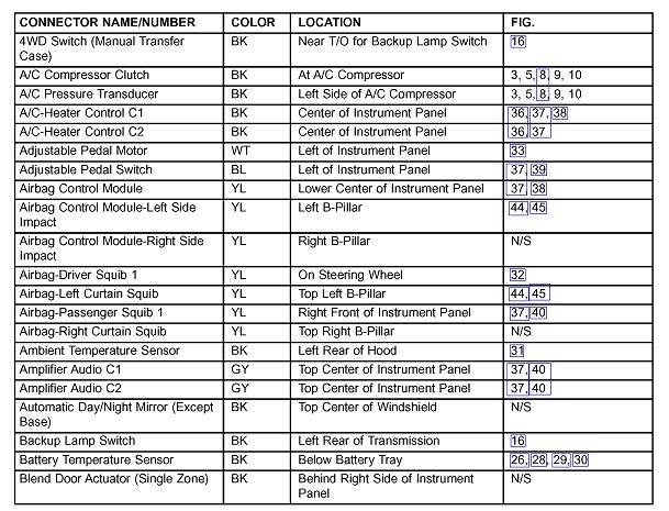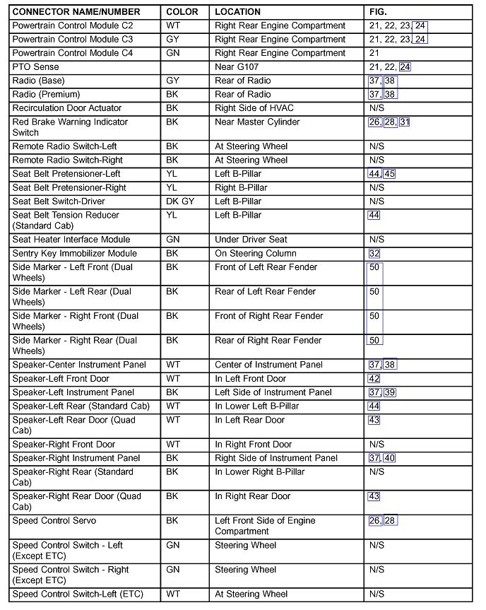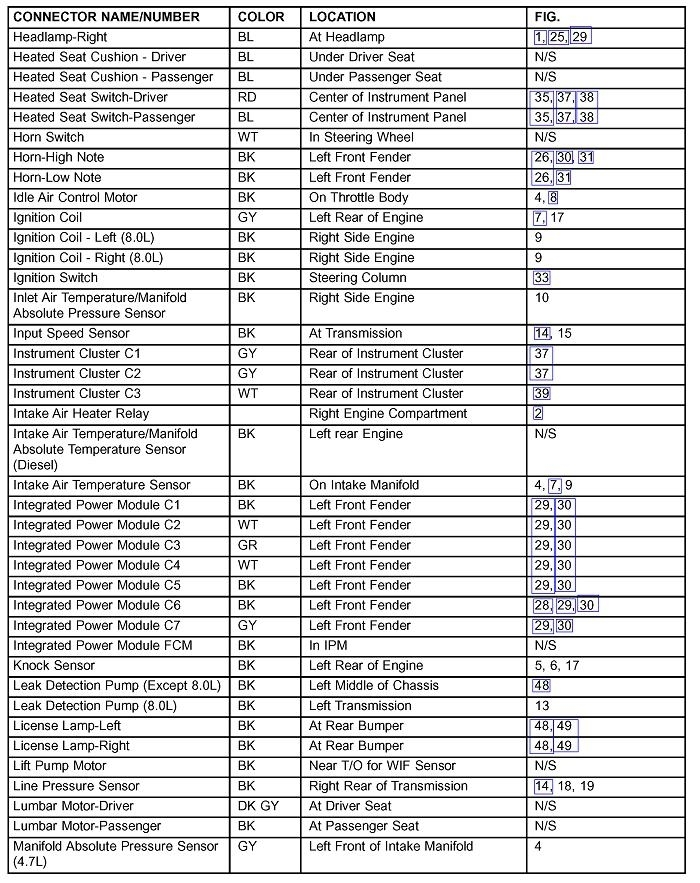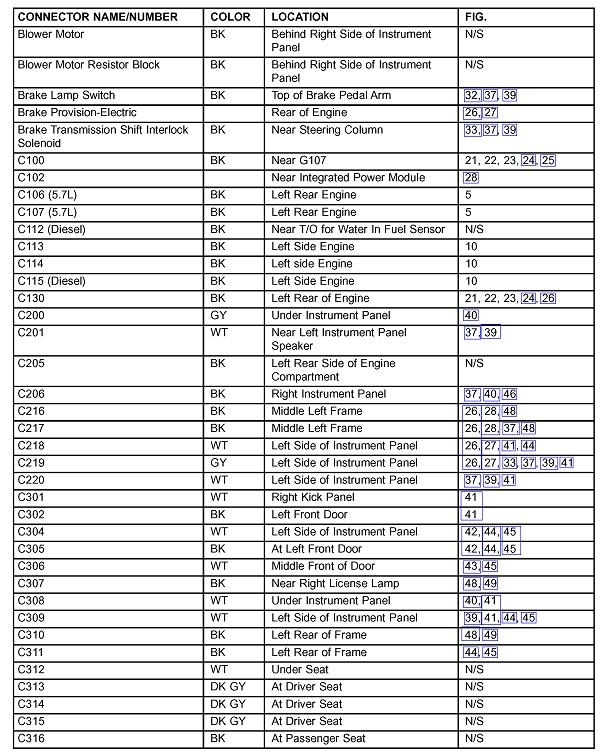 For the connector pin-outs themselves, tell me exactly which connectors you need and where they're located on the truck. Use these charts as a guide. Those that have a blue box around the number have drawings to show where they're located.
