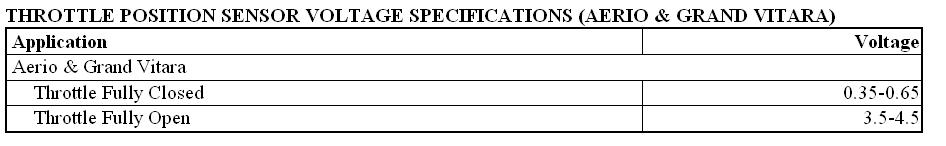 sensor clockwise or counterclockwise and tighten screws when specified voltage is obtained. See THROTTLE POSITION SENSOR VOLTAGE SPECIFICATIONS table. After TP sensor adjustment, disconnect battery negative cable. Leave battery cable disconnected for 5 minutes or more and reconnect negative battery cable.