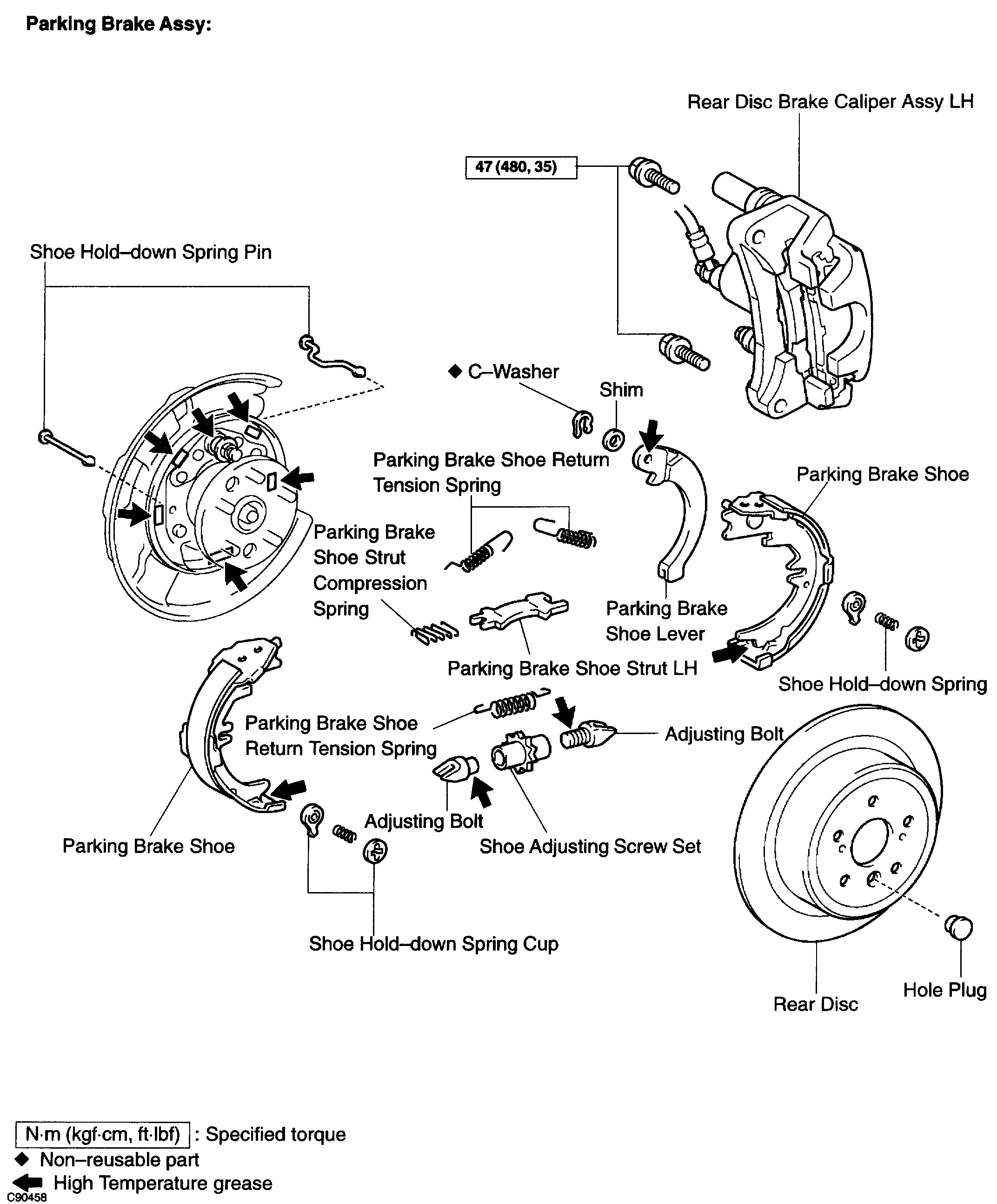NOTICE: There should be no oil or grease adhering to the friction surface of the shoe lining and disc.