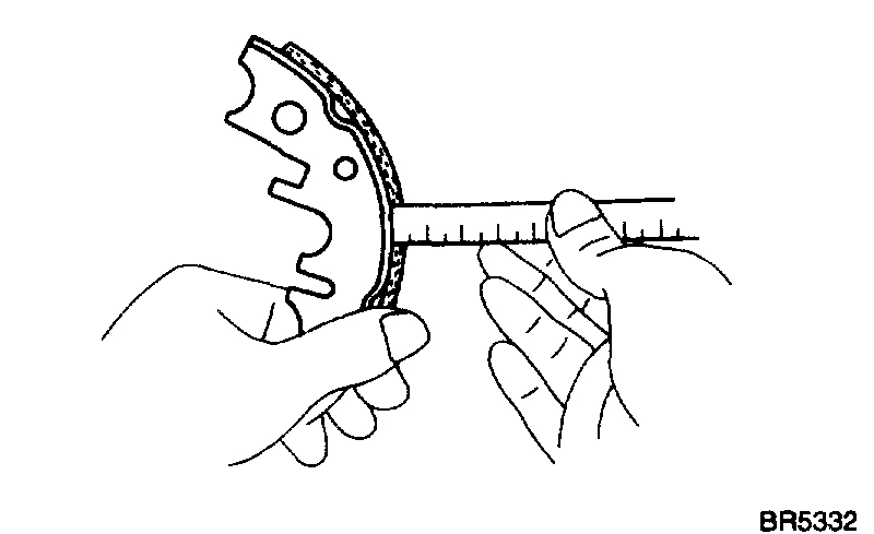 If the lining thickness is at the minimum thickness or less, or if there is severe, uneven wear, replace the brake shoe.