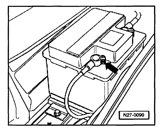 Disconnect negative GND terminal -arrow- from battery negative (-) post.