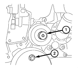 Remove the water pump pulley (2) and the idler pulley (1).