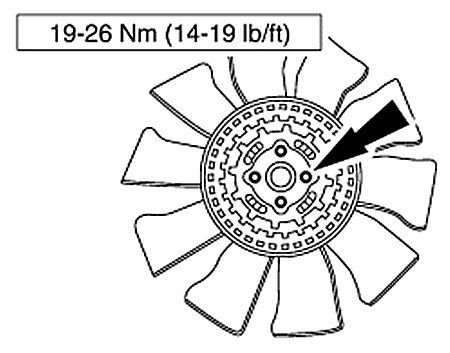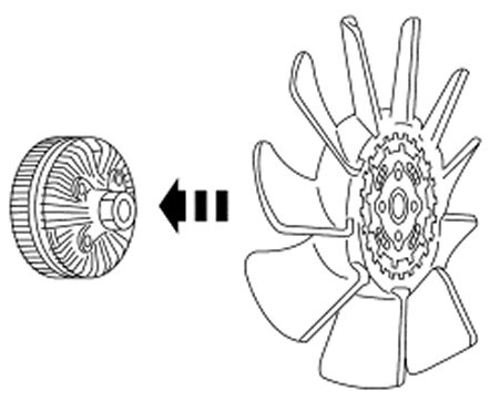 2. Remove fan retaining bolts, then the fan and shroud assembly.