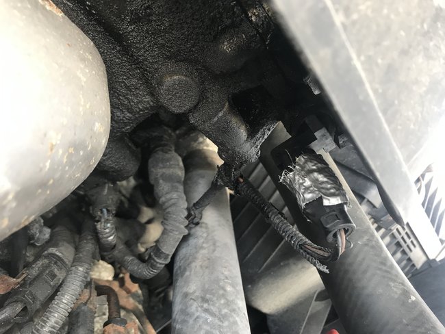 I'm not sure which sensor you are referring to. However, I do see one with tape on it. Is that the one you are referring to? The wiring (other than the wire loom) looks okay, but the connector may be bad. Remove it and check if the pins are in good condition, not pushed in, and making connection.