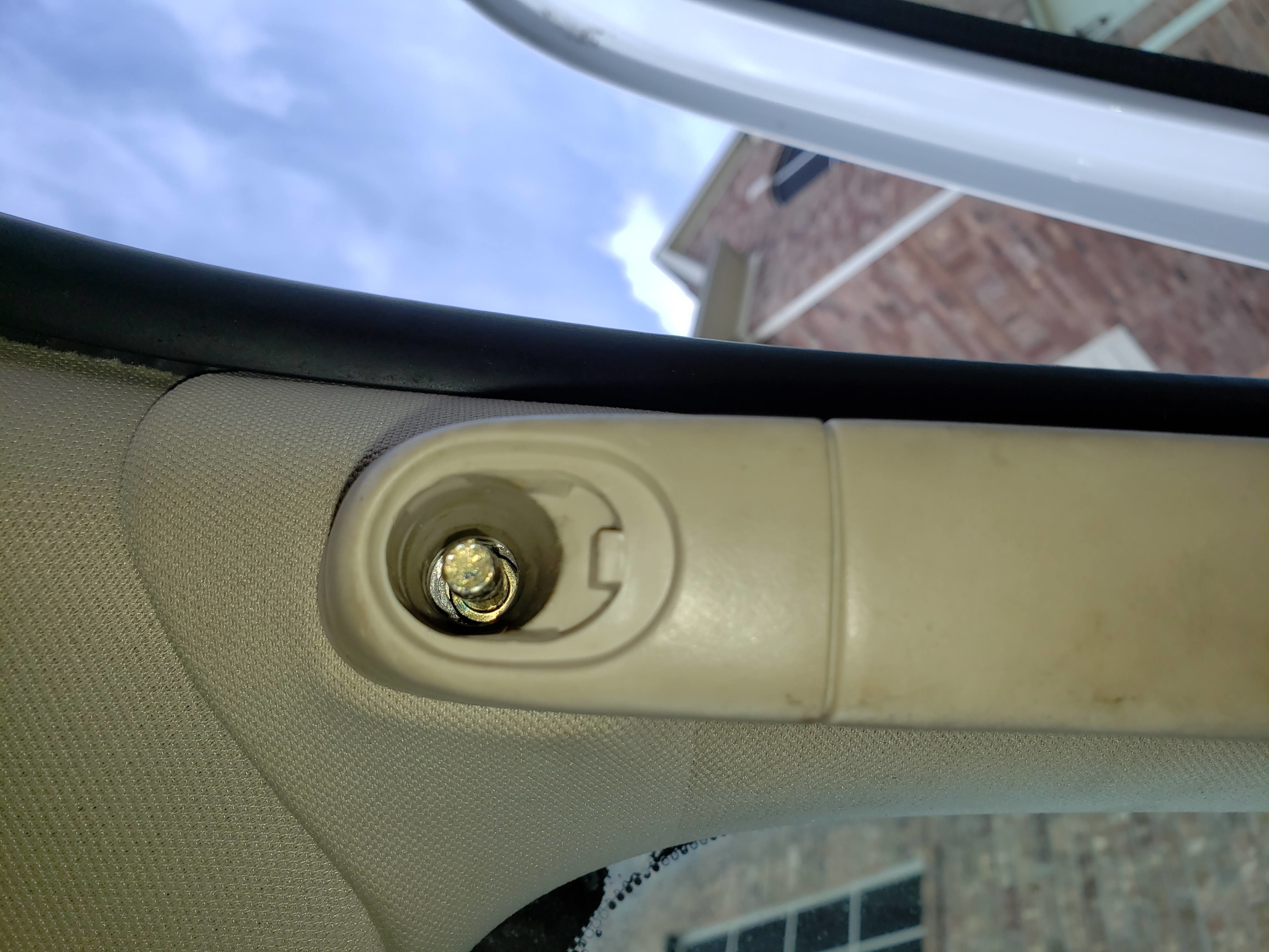 Now as far as getting the grab handle and trim panel off, the grab handle has two screws hidden under plugs on the ends of the handle, use a trim pick to remove the plugs and remove the screws, refer to second image. The trim panel itself snaps into place with clips. You pull it in toward the dash and up to release the lower hook and then down to release the upper clips.